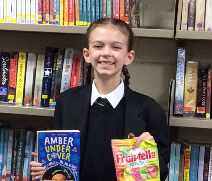 One of our runners up, Isabel was in the library and was delighted with her prizes.