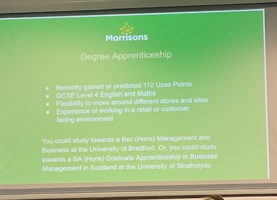 Sarah and Julia from Morrisons explained about the wide range of jobs within this sector – not just retail, but logistics, manufacturing and IT too. Morrisons also pay over and above the minimum apprenticeship rate, recognising the requirement to balance work with on-going study.